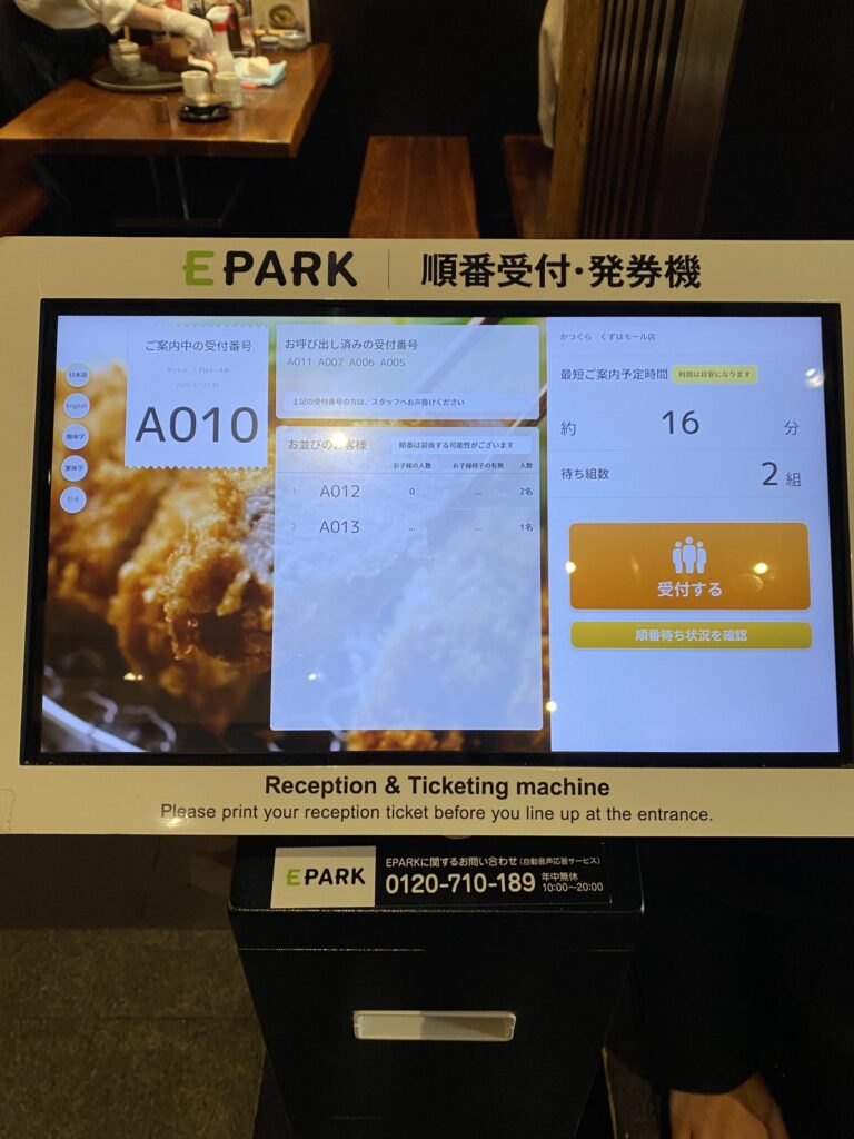 お店がオープンした後に行く場合は入口入ってすぐのEPARKの受付機で順番受付を行いましょう!